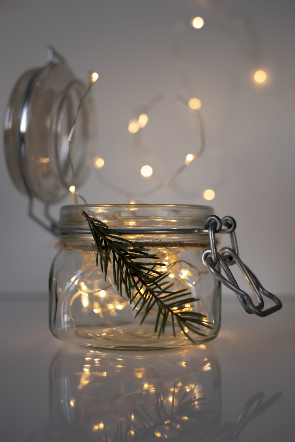 En vez de comprar guirnaldas de luces nuevas, reutiliza las del año pasado y dales un toque distinto colocándolas dentro de botellas o frascos de cristal.